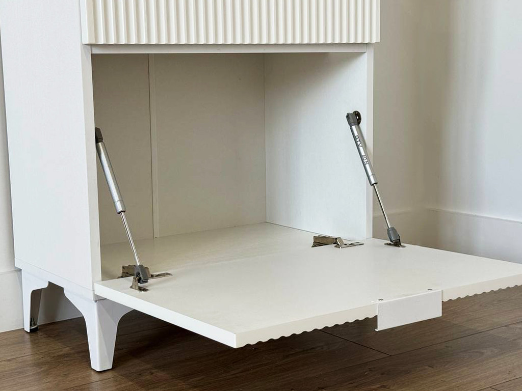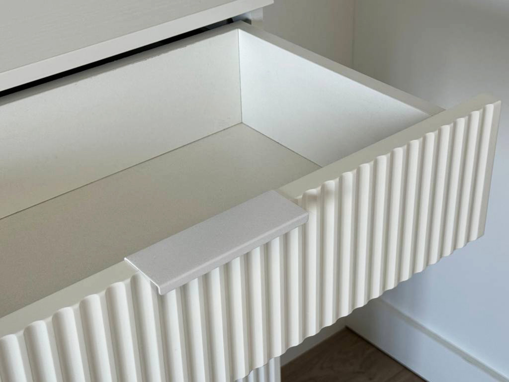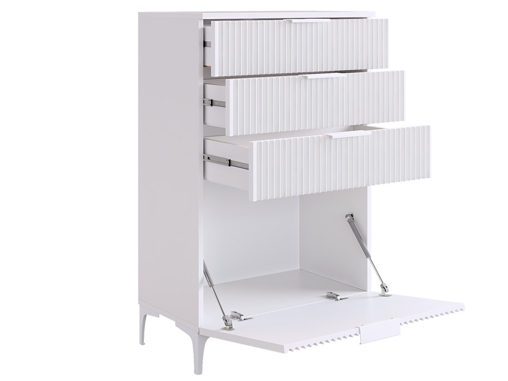 Комод «Зефир» — идеальное решение для детской и гостиной комнат. Он оснащён выкатными ящиками и откидной секцией, обеспечивая максимальный комфорт и удобство использования. Фасады украшены изящной фрезеровкой, которая придаёт изделию неповторимый шарм и элегантность.