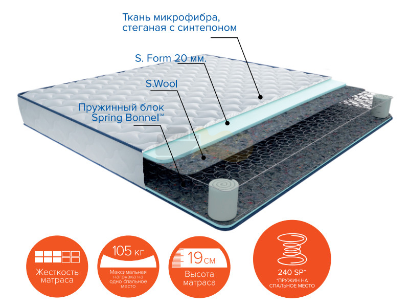 Наполнение: Зависимый пружинный блок "Spring Bonnel" (240 пружин на спальное место) + термовойлок S.Wool + ортопедическая пена S.Form 2 см.