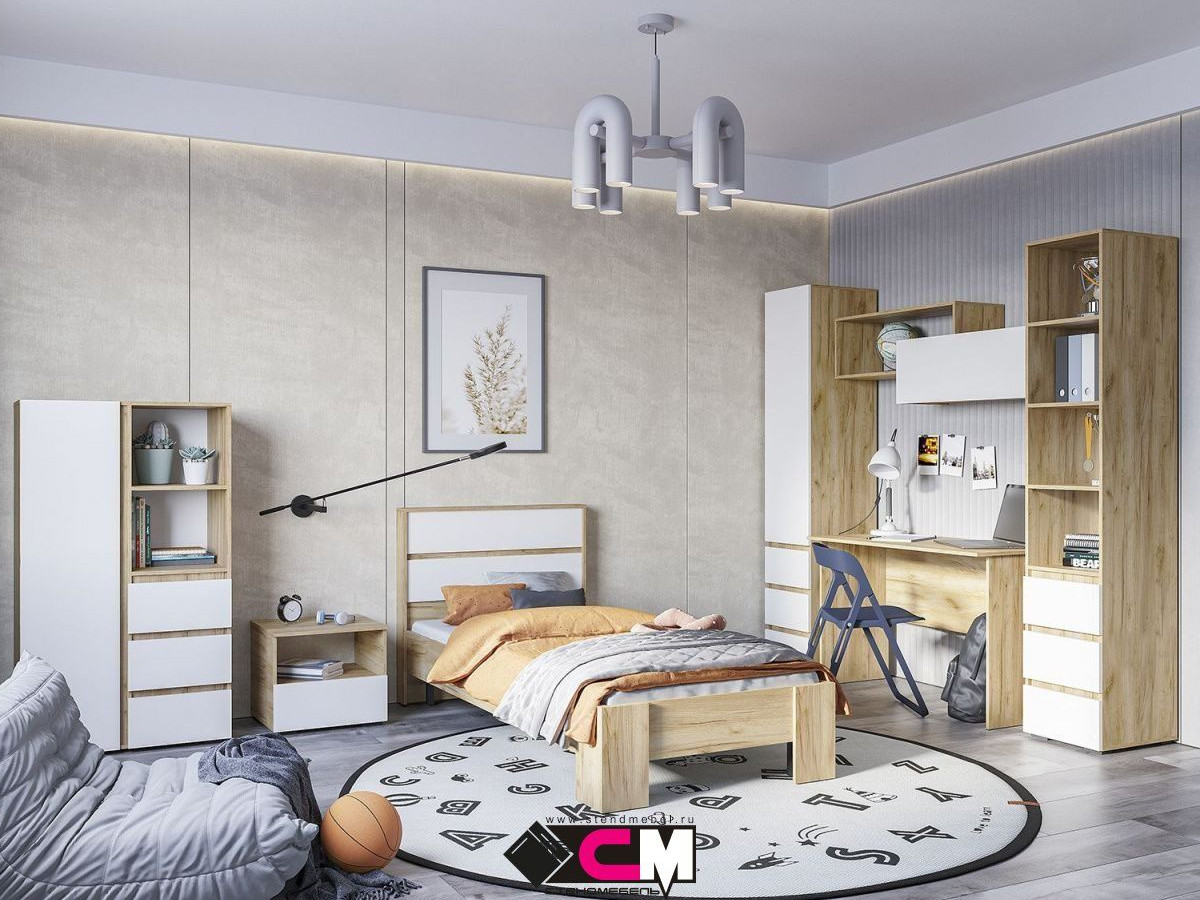 Цена за комплект на фото: ПС 01 Письменный стол, ПН 02 Пенал, ПН 03 Пенал, ПЛ 01 Полка, КР 01 Кровать, ТБ 01 Тумба, ШК 03 Шкаф