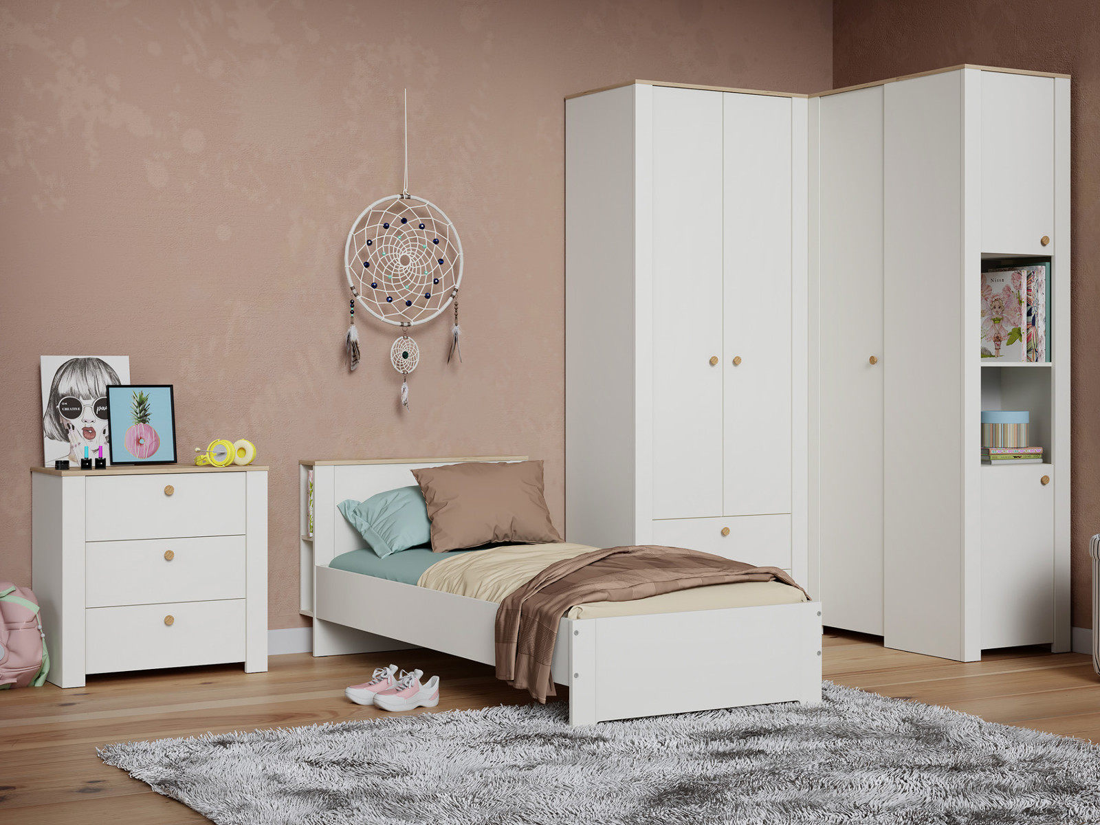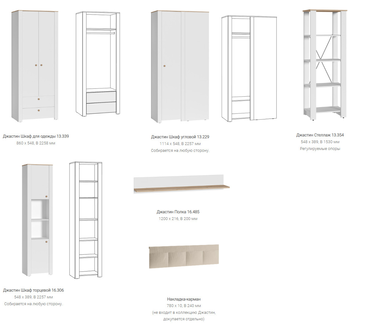 Цена за комплект: Комод 16.228.03, Шкаф для одежды 13.339, Шкаф угловой 13.229, Шкаф торцевой 16.306, Кровать 11.54