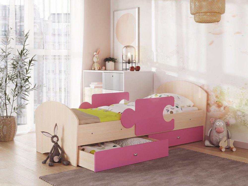 - Кровать Мозаика с бортиками и ящиком млечный дуб с розовым