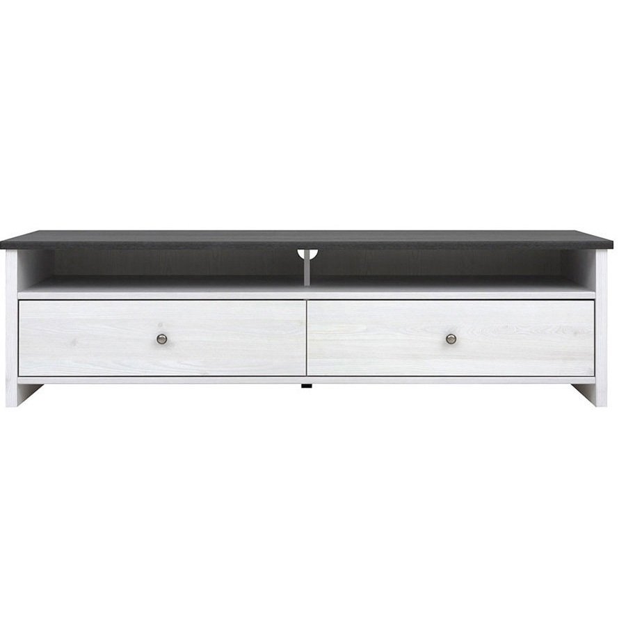 Тумба под телевизор содержит два выдвижных ящика на роликовых направляющих и два открытых отделения с отверстием в задней стенке для проводов. Оборудована небольшими круглыми металлическими ручками серебристого цвета.