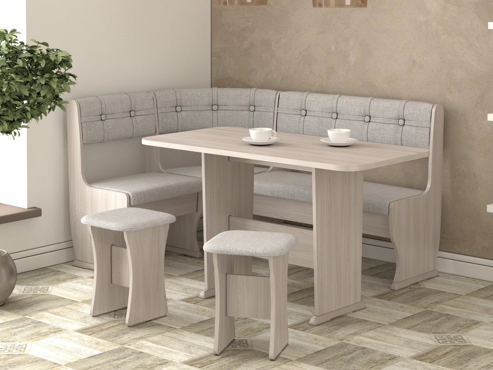 - Корпус ЛДСП в цвете ясень шимо светлый, скамья и табуреты обтянуты тканью полинейлон.