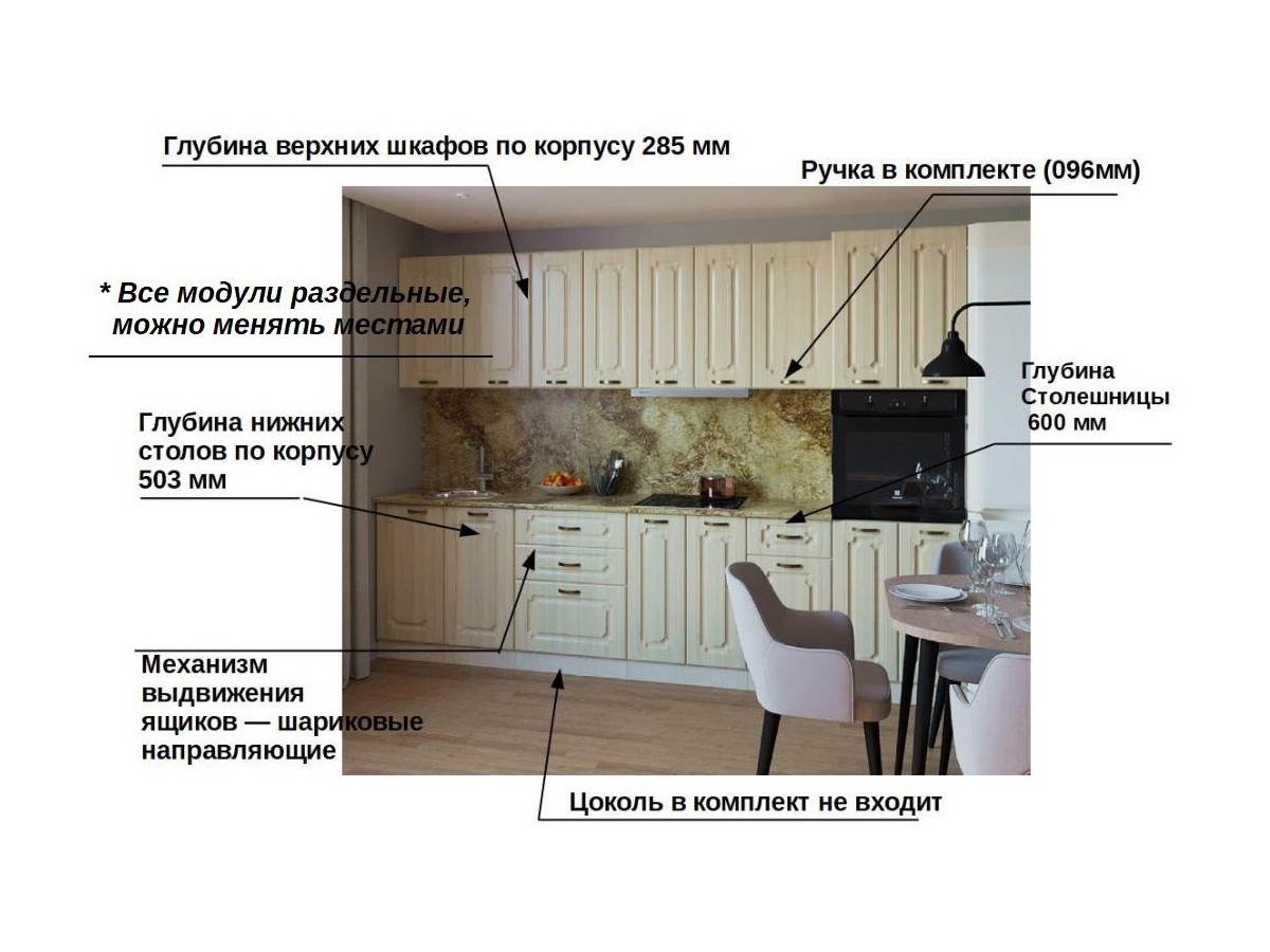 Кухонная мойка, стеновая панель, посудосушитель, планки для столешницы в комплект не входят.