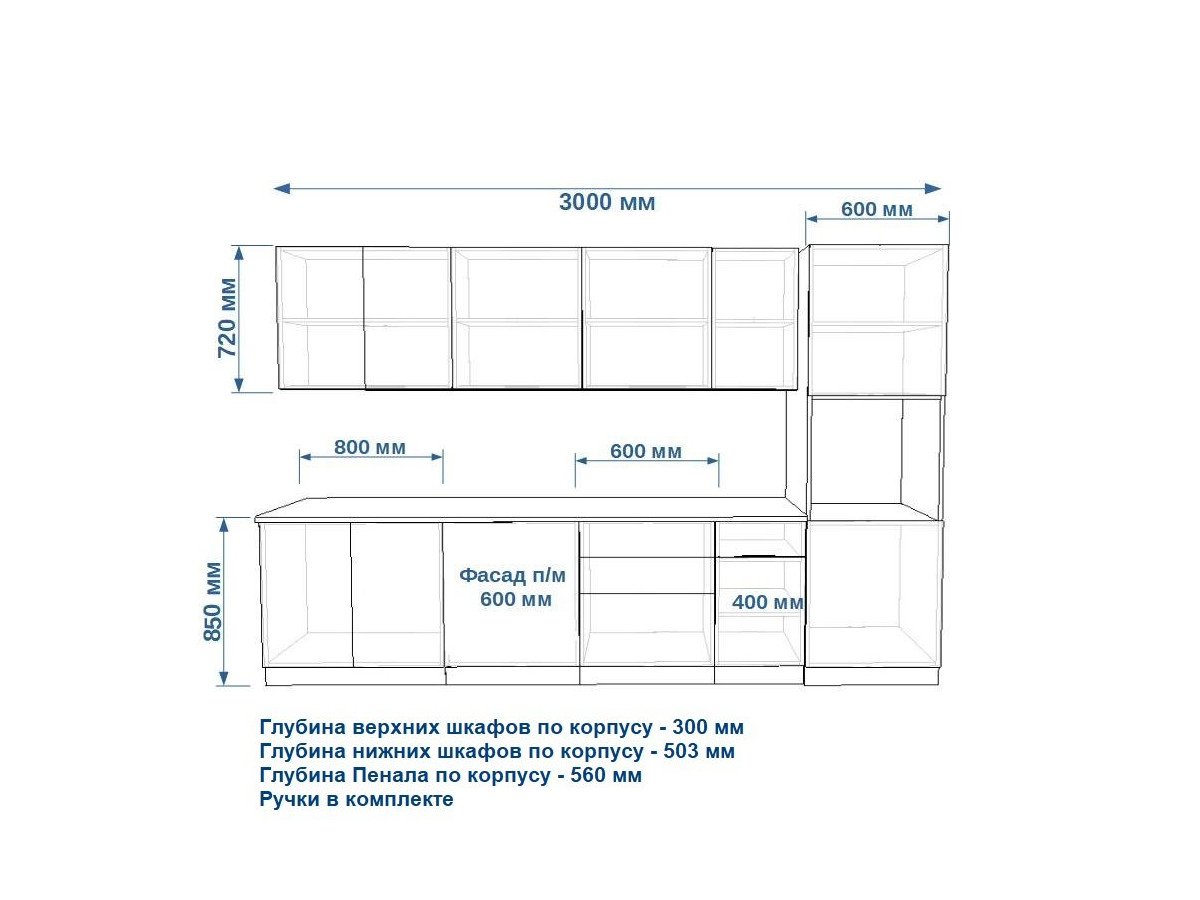 Кухонная мойка, стеновая панель, посудосушитель, планки для столешницы в комплект не входят.