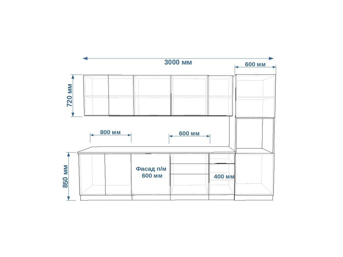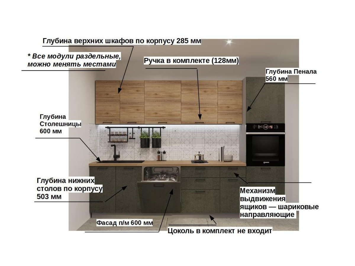 Кухонная мойка, стеновая панель, посудосушитель, планки для столешницы в комплект не входят.