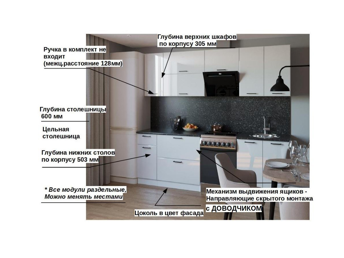 Кухонная мойка, стеновая панель, посудосушитель, планки для столешницы в комплект не входят.