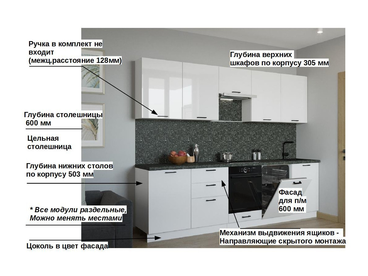 Кухонная мойка, стеновая панель, посудосушитель, планки для столешницы в комплект не входят.