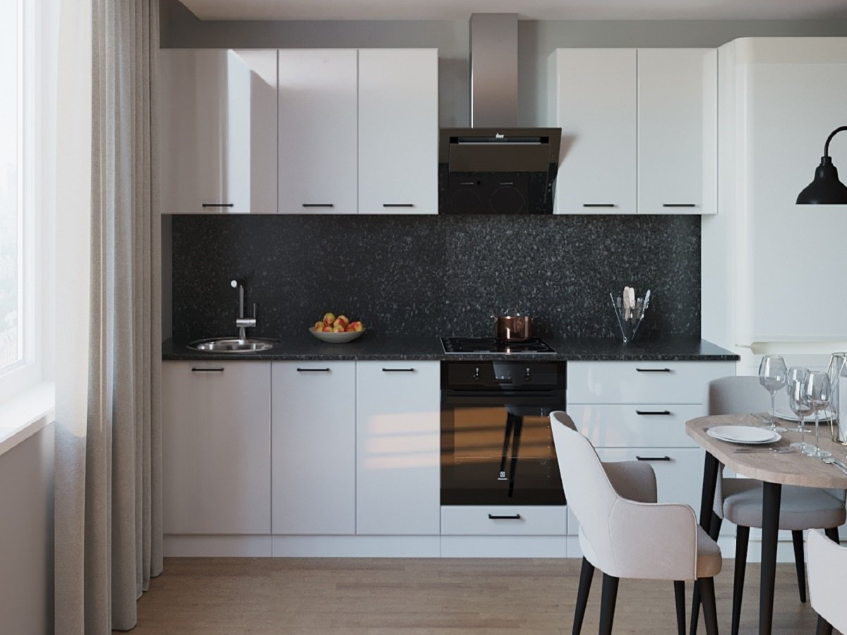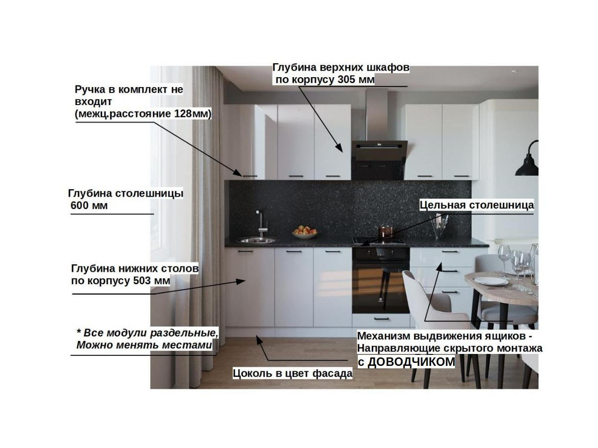 Кухонная мойка, стеновая панель, посудосушитель, планки для столешницы в комплект не входят.