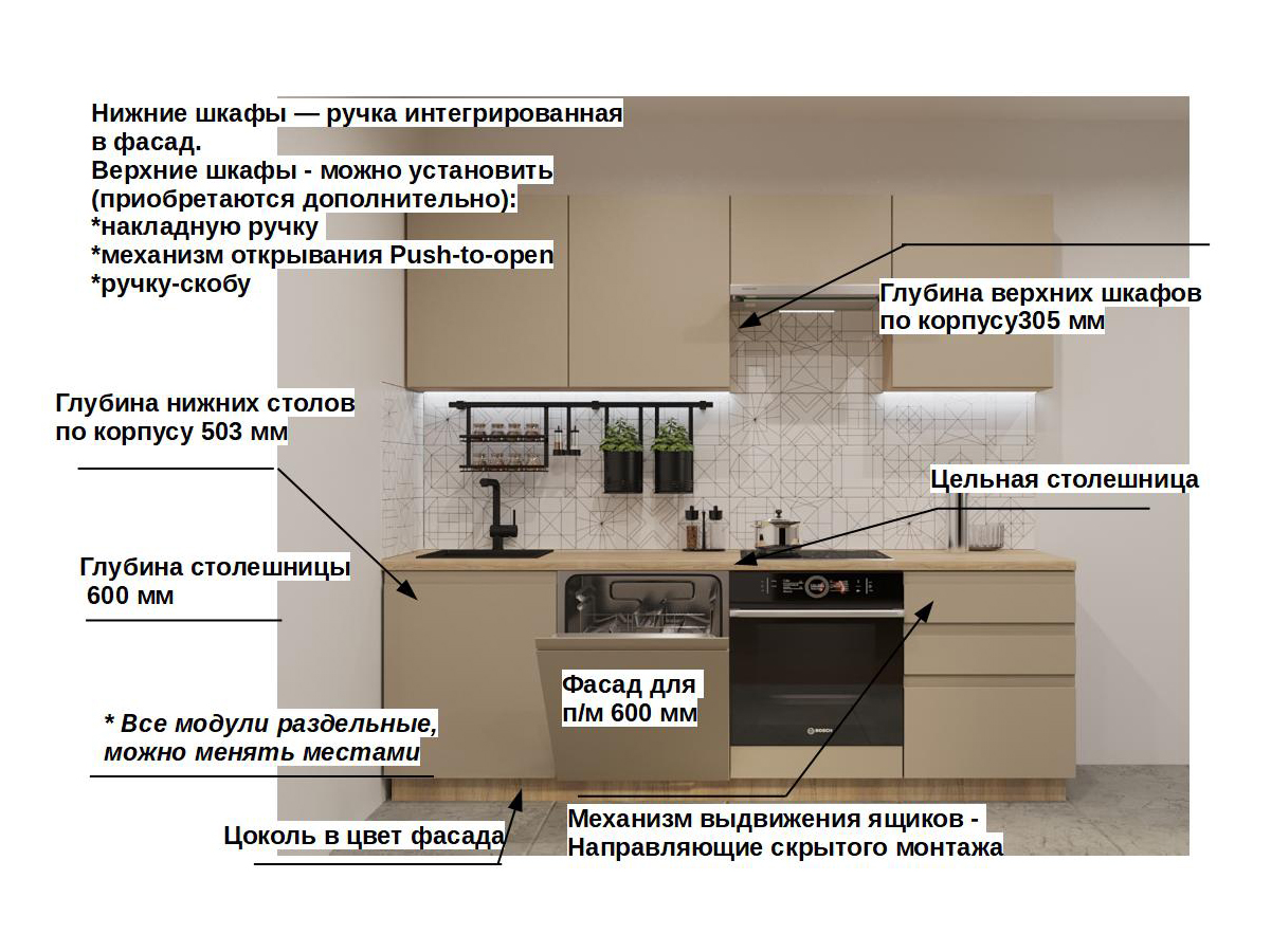 Кухонная мойка, стеновая панель, посудосушитель, планки для столешницы в комплект не входят.