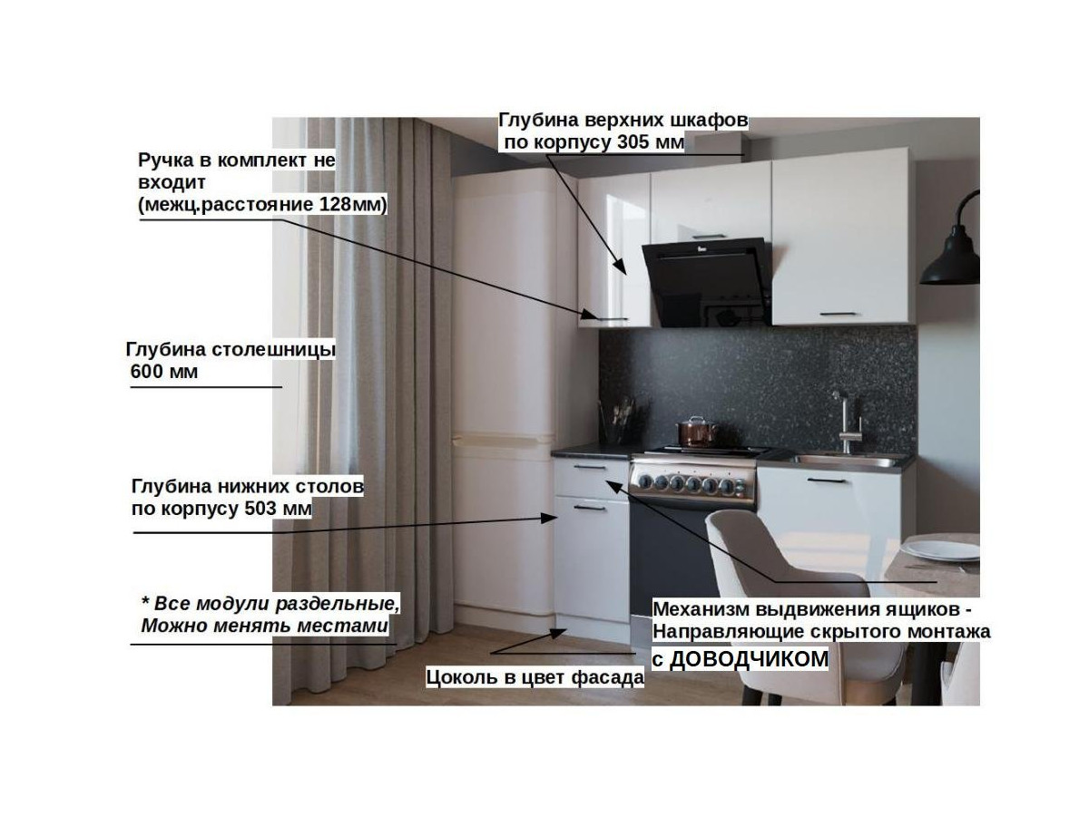 Кухонная мойка, стеновая панель, посудосушитель, планки для столешницы в комплект не входят.