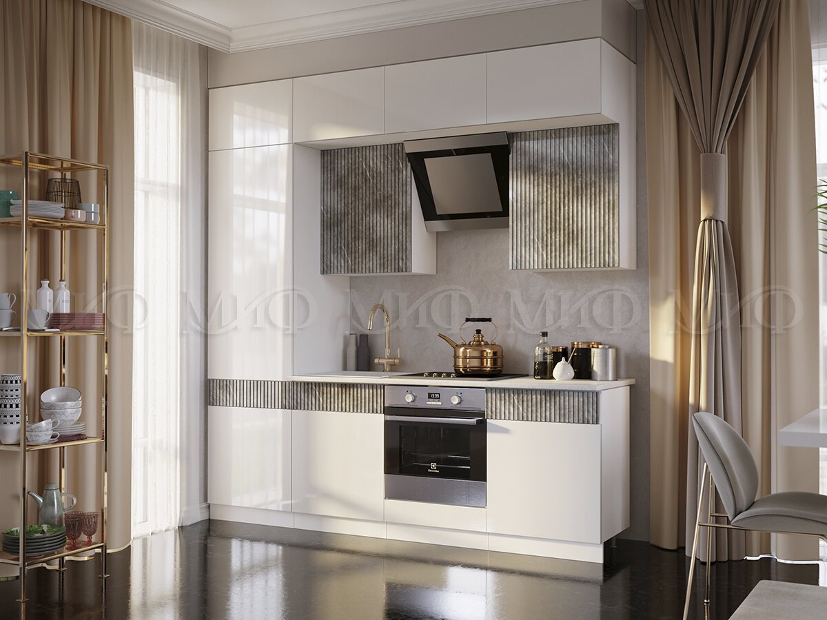 - Кухонный гарнитур Оливия 2400 Белый глянец холодный/Мрамор золото