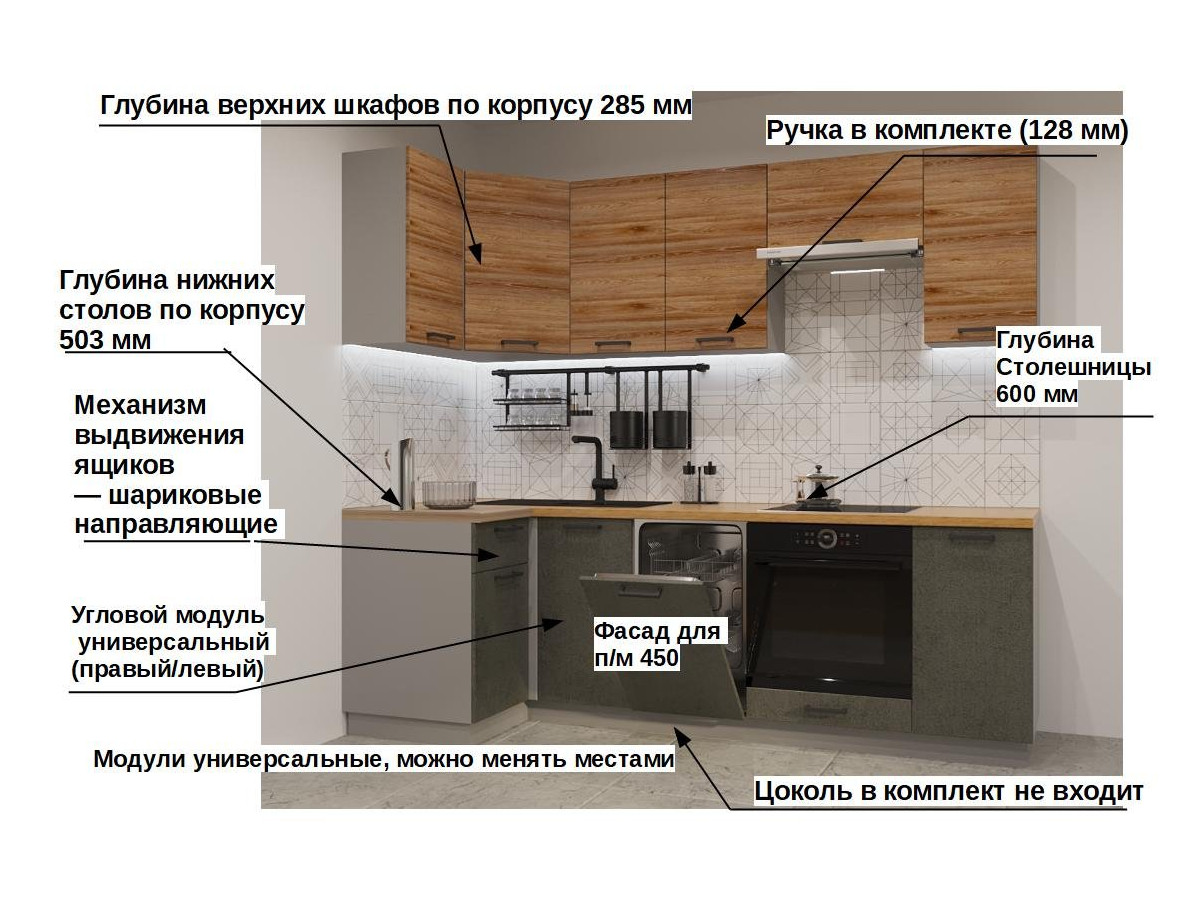 Кухонная мойка, стеновая панель, посудосушитель, планки для столешницы в комплект не входят.