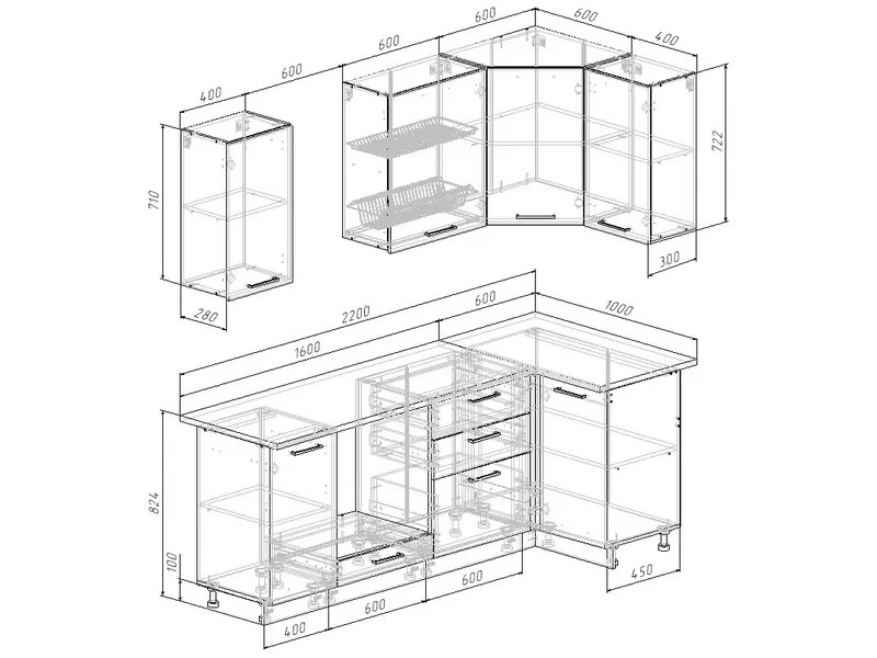 Ширина кухни: 2200х1000 мм