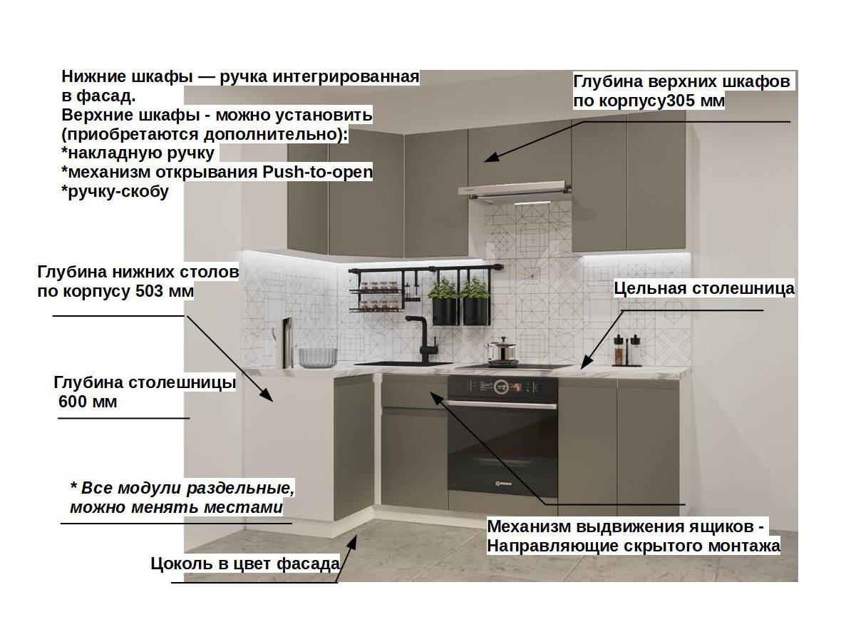 Кухонная мойка, стеновая панель, посудосушитель, планки для столешницы в комплект не входят.