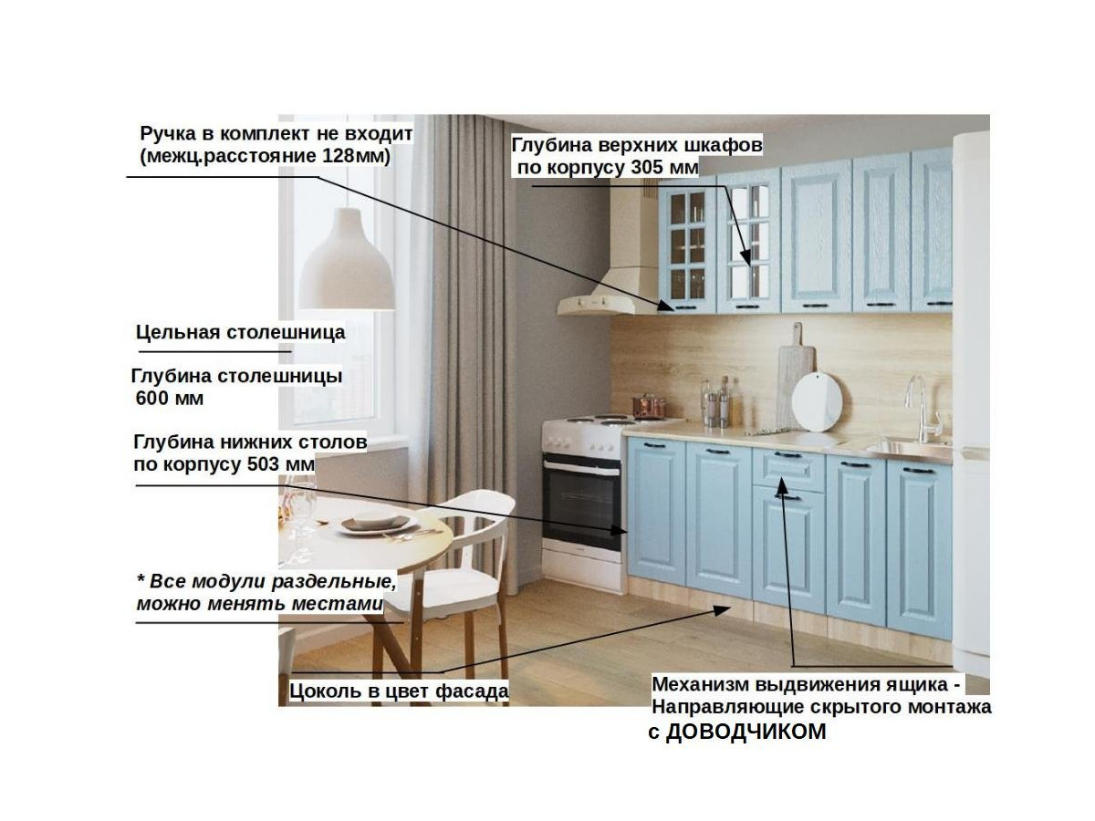 Кухонная мойка, стеновая панель, посудосушитель, планки для столешницы в комплект не входят.