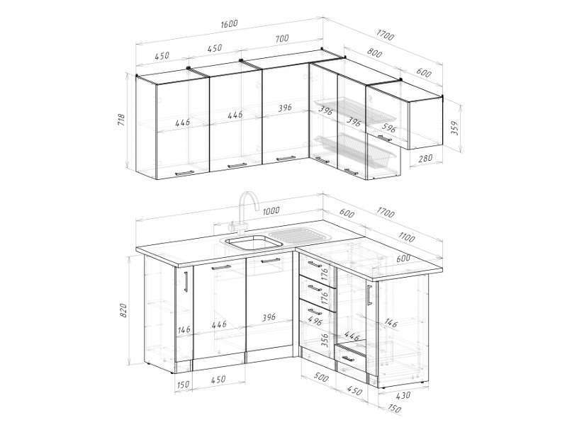 Мойка, смеситель, стеновая панель и посудосушитель в комплект гарнитура не входят.