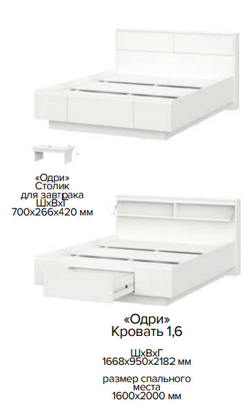 - Кровать двойная (1,6х2,0) ( 131,9 кг; 0,261 м3) ( 1668х950х2182, столик 700х266х420 мм)