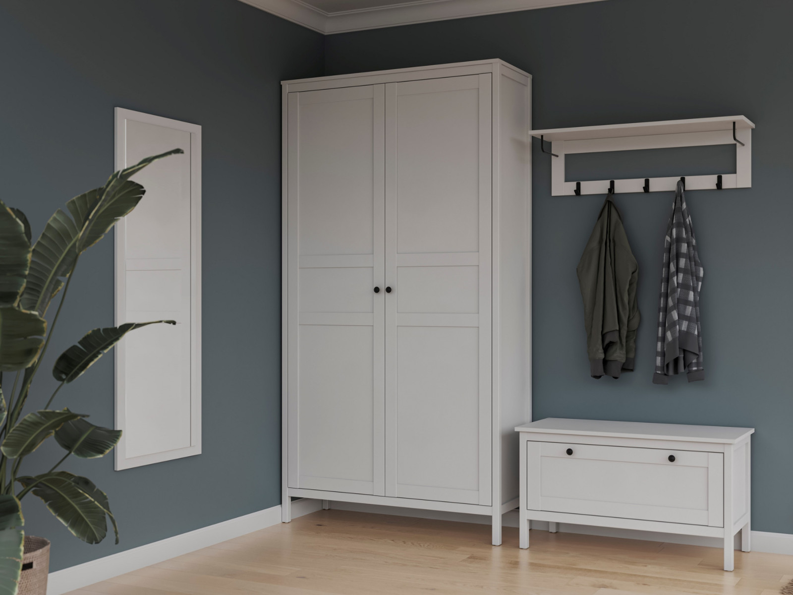 Цена за комплект: Шкаф для одежды 2-дверный, Дверь в шкаф для одежды глухая (2шт), Вешалка широкая, Тумба низкая широкая