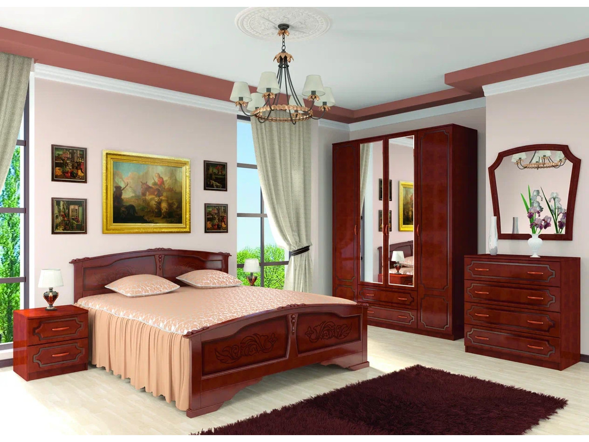 Цена за комплект: зеркало навесное, комод 4 ящика, тумба прикроватная, шкаф ШР-4 платье и бельё с зеркалом, Комплектующие на кровать с ламелями 1400 мм, кровать Елена 1400мм