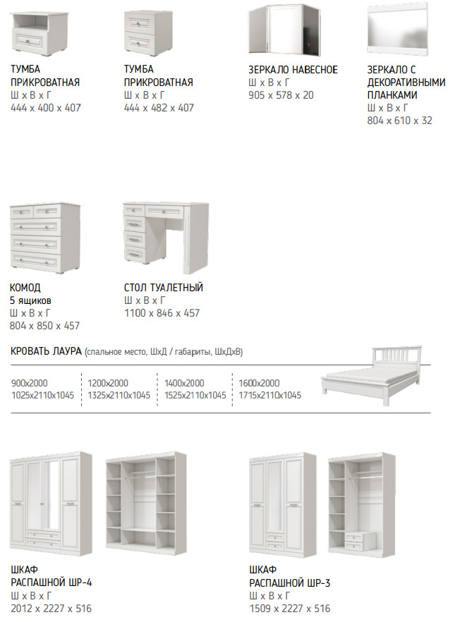 Цена за комплект: зеркало навесное,комод 5 ящиков, тумба прикроватная 1 ящик, шкаф для одежды ШР-4 , кровать двойная "Лаура" 1400, Комплектующие на кровать с ламелями 1400 мм