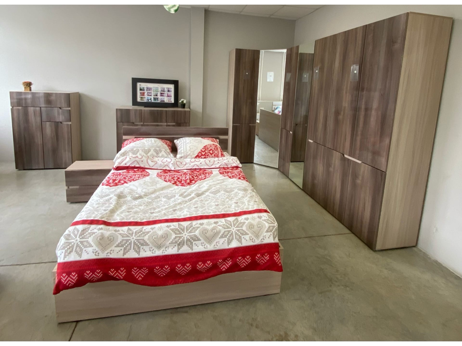 Состав комплекта: шкаф 2-х створчатый, шкаф 3-х створчатый, шкаф угловой, пенал , комод-800, тумба прикроватная, комод-1200, кровать-1400, основание 1400, опоры для основания