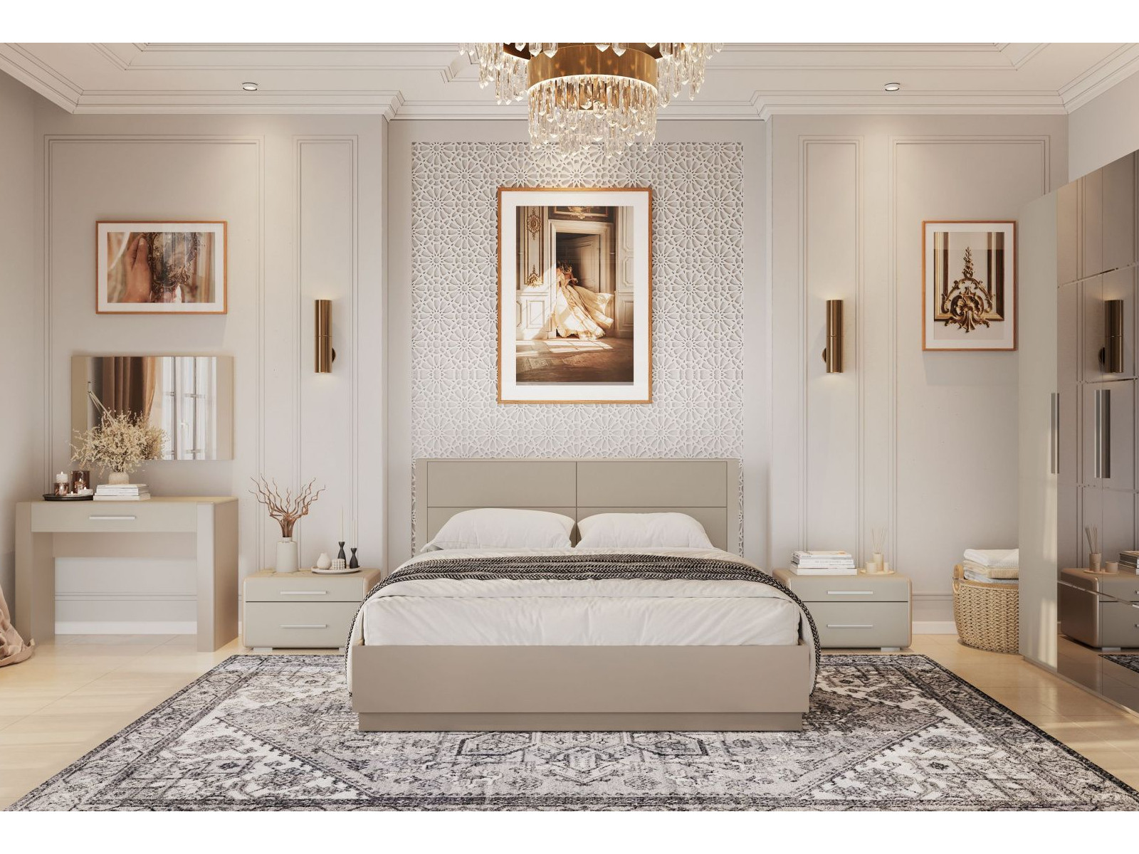 Цена указана за комплектацию на фото: зеркало, стол туалетный,тумба прикроватная (2шт), кровать двойная 1400, металлокаркас
