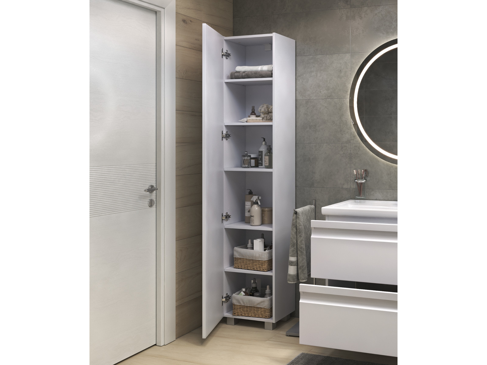 Оснащение: 1 дверца; 5 полок ЛДСП, петли с механизмом доводчика, 4 опоры квадратные регулируемые