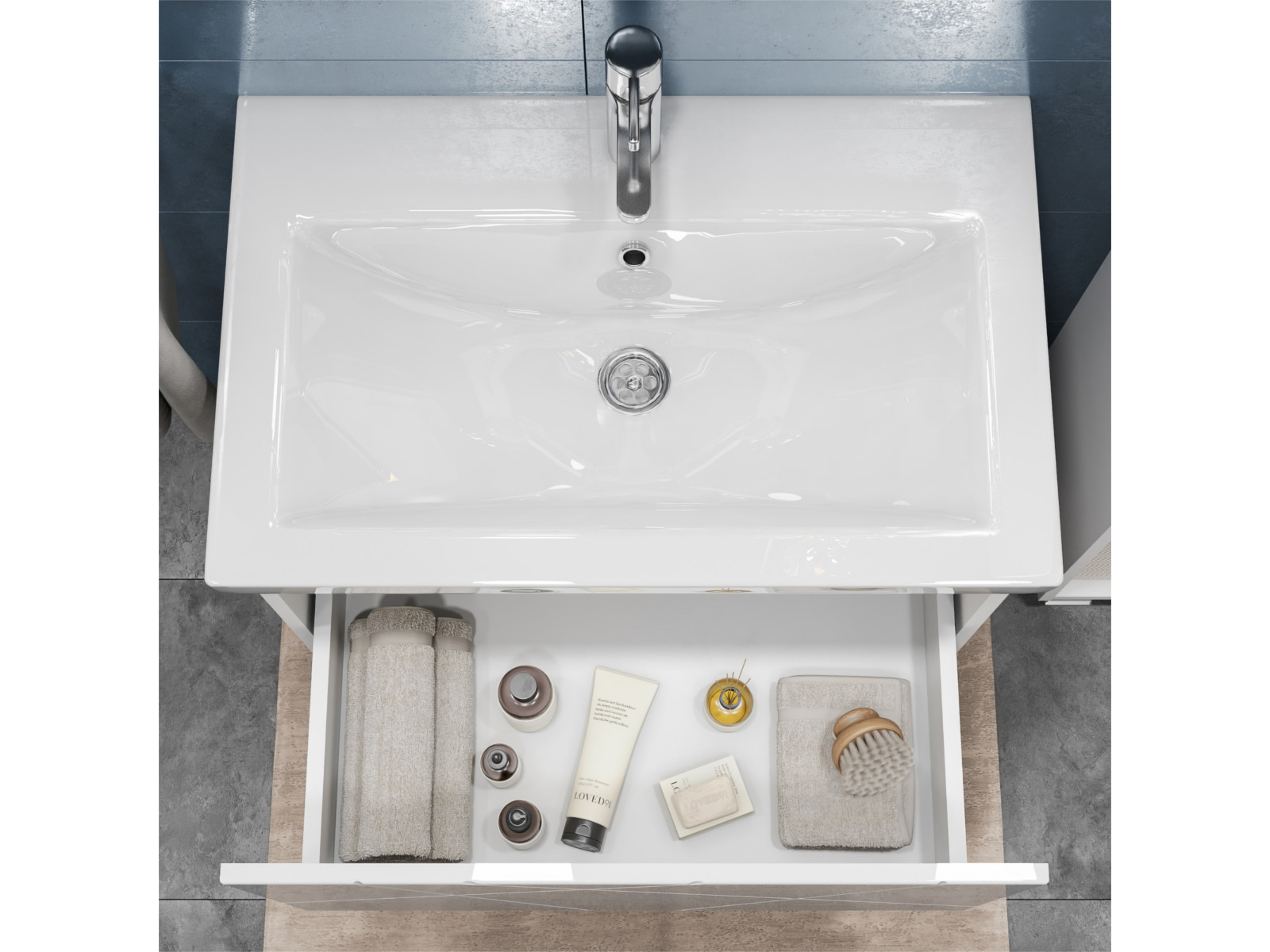 Оснащение: 1 выдвижной ящик, направляющие скрытого монтажа, открывание нажатием "push-to-open", 2 навеса, 1 сифон