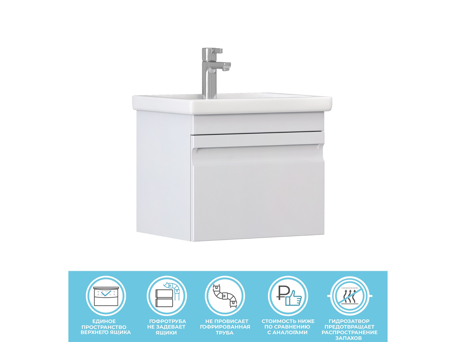 Оснащение: 1 выдвижной ящик, шариковые направляющие полного выдвижения, сифон