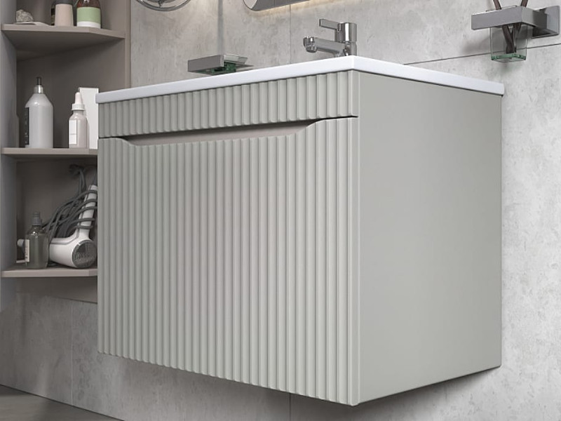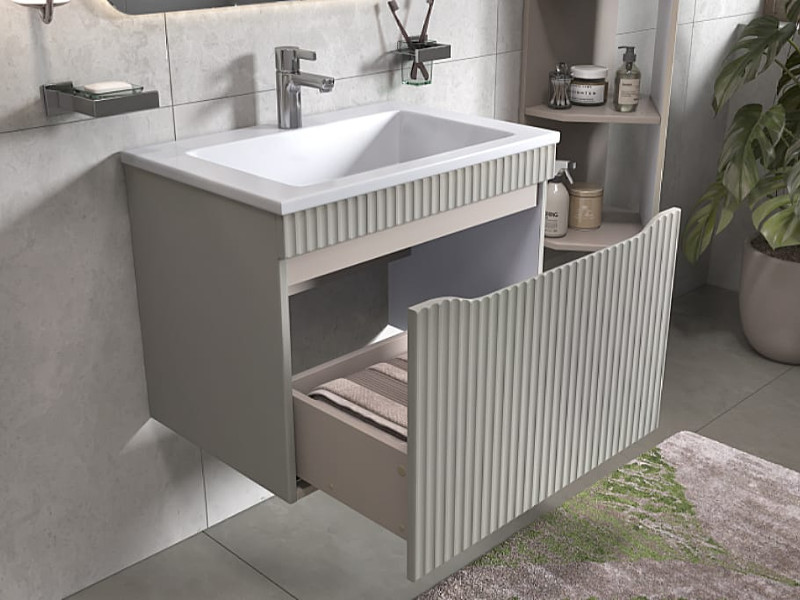 Материалы тумбы: влагостойкая МДФ, полимерное покрытие ПВХ, внутренние элементы из ЛДСП, европейская фурнитура