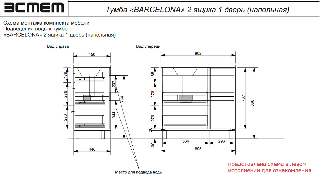 Тумба с раковиной Barcelona 900 правосторонний напольный 2 ящика 1 дверь