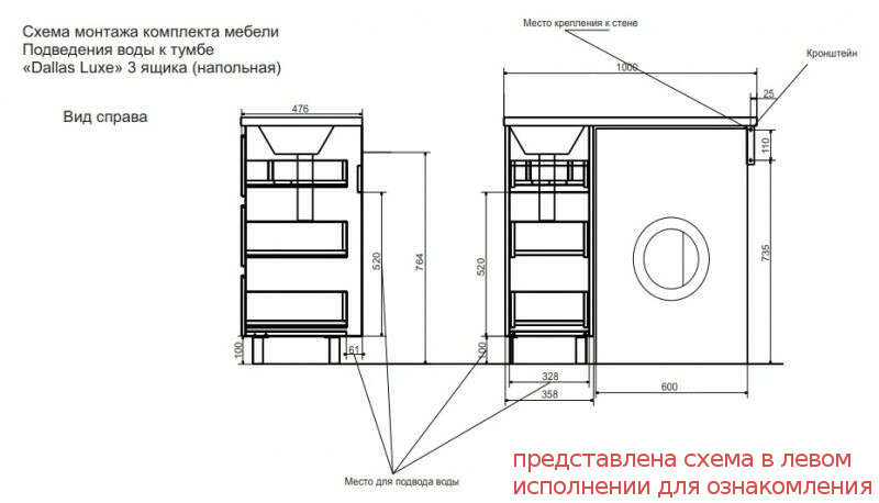 - Тумба с раковиной Dallas Luxe 1000 напольная 3 ящика правая