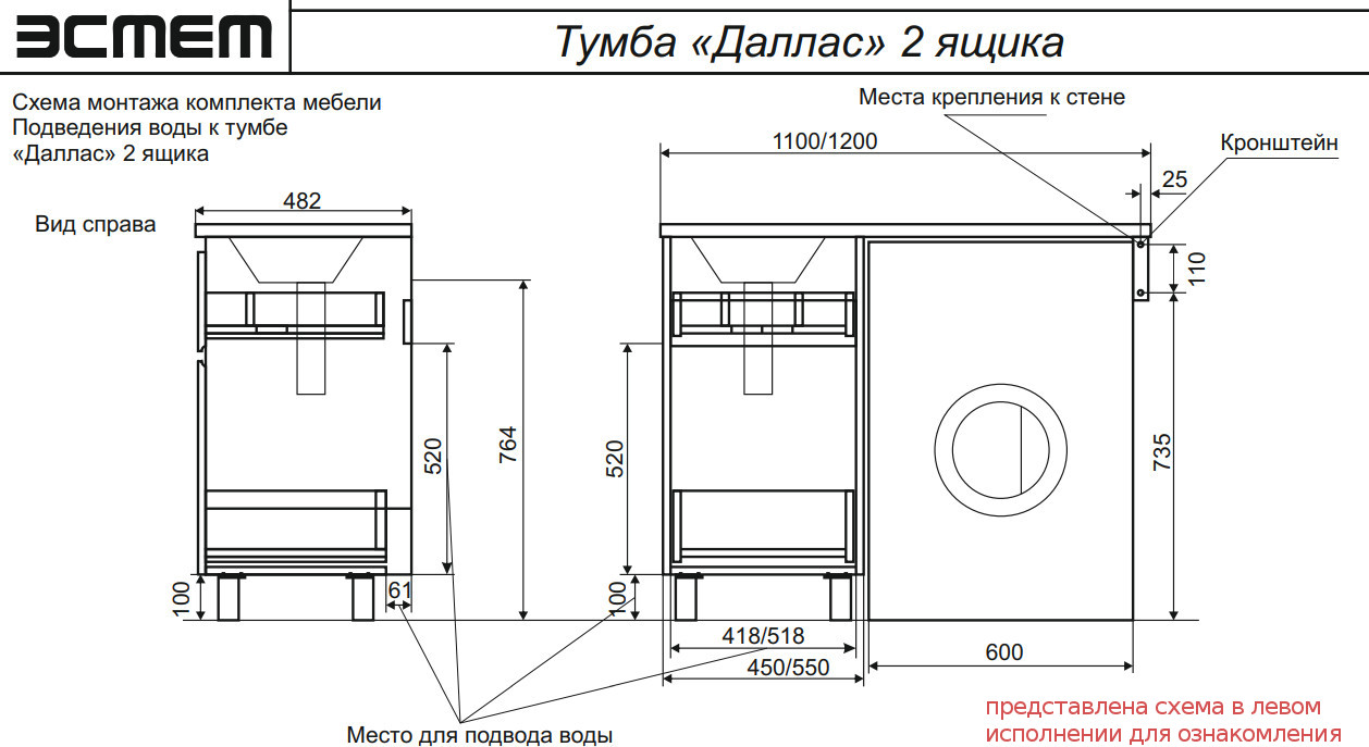 - Тумба с раковиной Dallas Luxe 1100 напольная 2 ящика правая