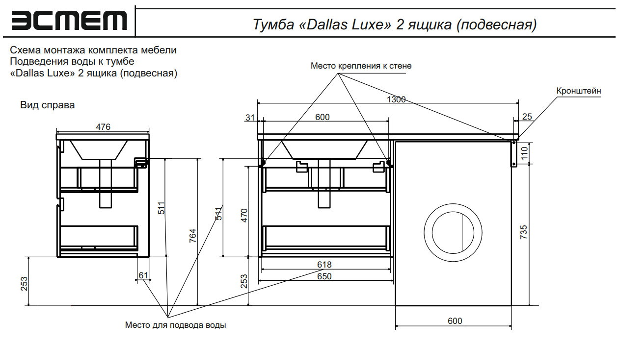 Тумба с раковиной Dallas Luxe 1300 навесная 2 ящика левая