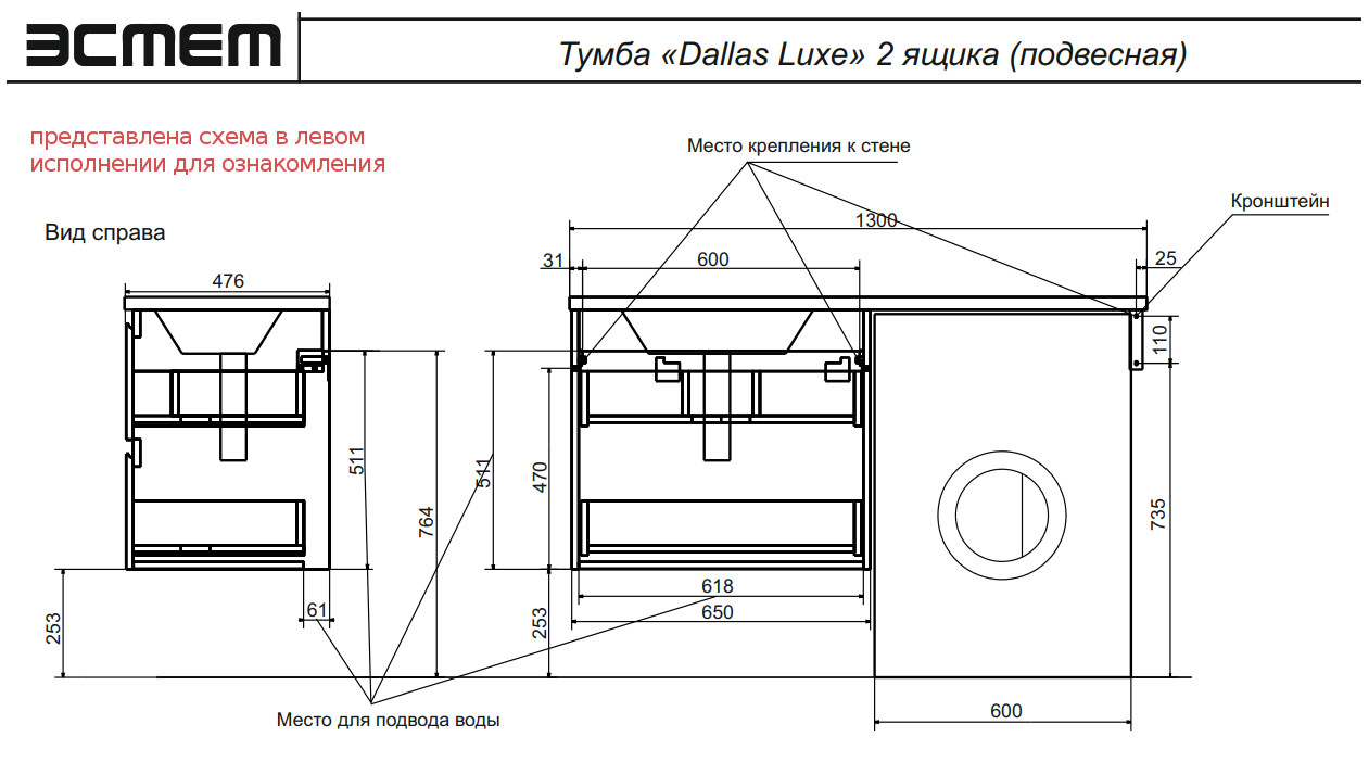Тумба с раковиной Dallas Luxe 1300 навесная 2 ящика правая