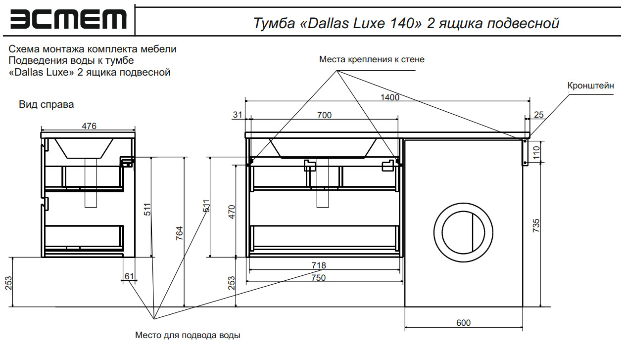- Тумба с раковиной Dallas Luxe 1400 навесная 2 ящика левая