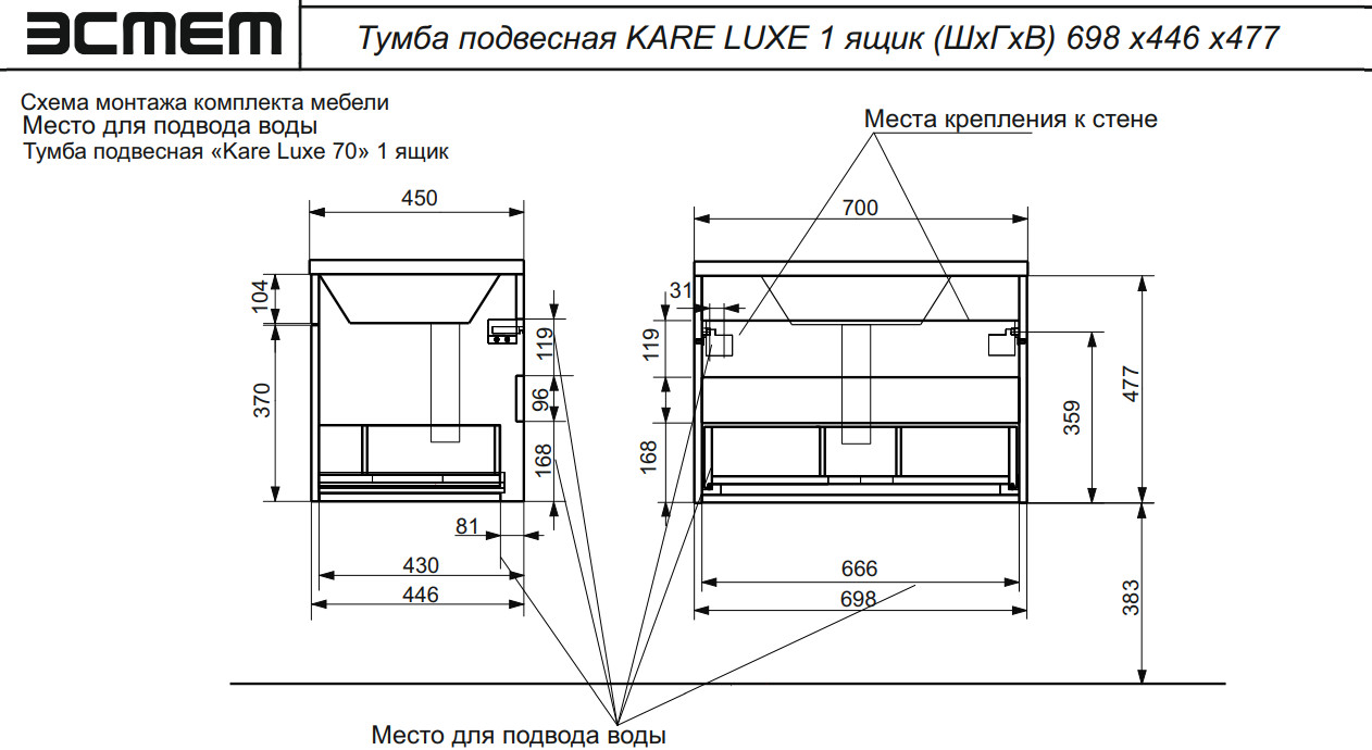 - Тумба с раковиной Kare Luxe 700 навесная 1 ящик