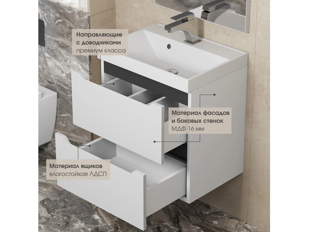 Выдвижные ящики изготовлены из влагостойкой ЛДСП. Ящики оснащены доводчиками. Вся фурнитура и доводчики премиум-класса.
