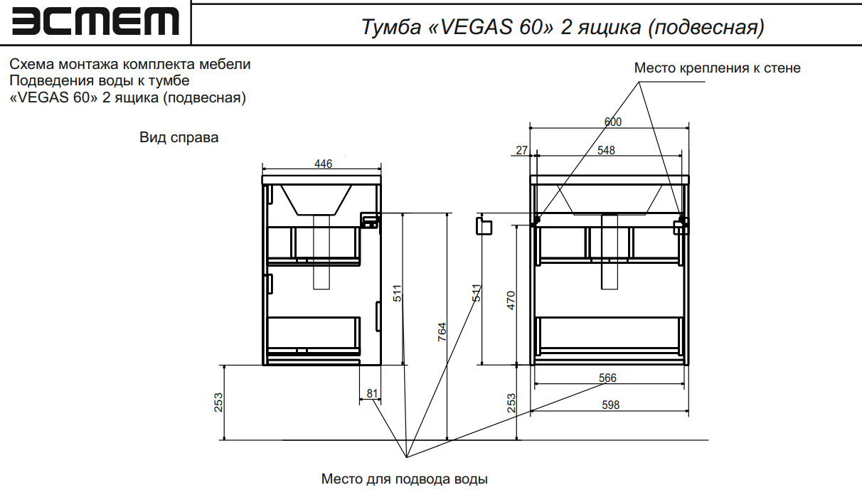 - Тумба с раковиной Vegas 600 навесная 2 ящика