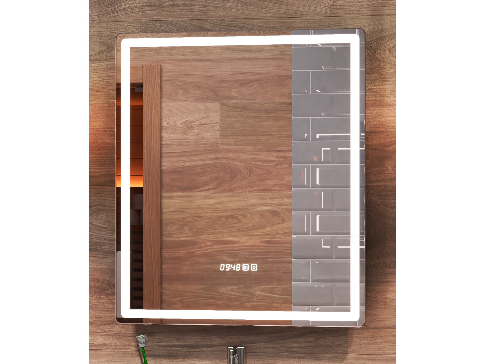 Оснащение: LED подсветка по периметру, сенсорное управление, часы, функция