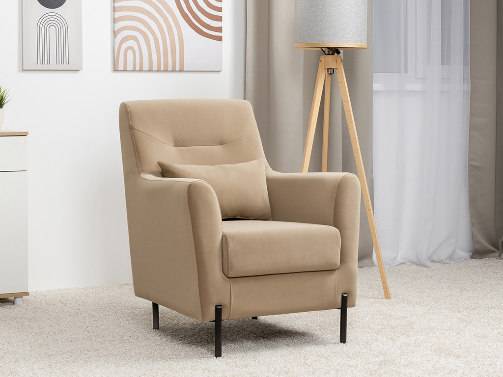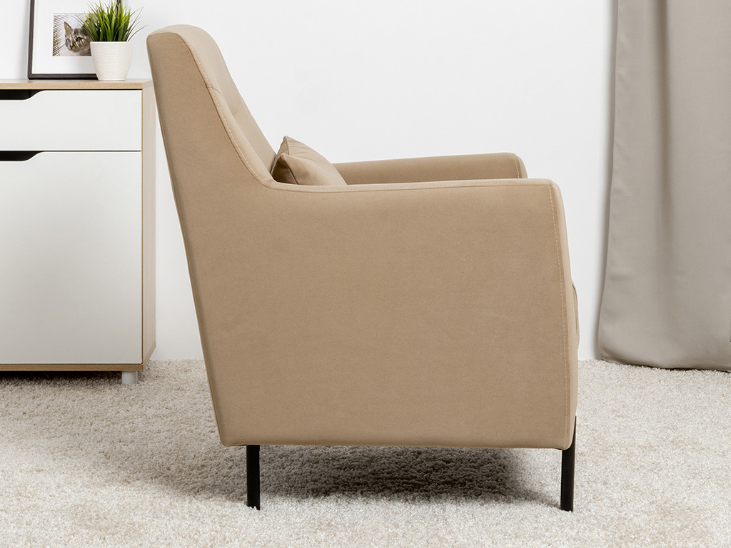 Декоративная утяжка на спинке кресла, декоративная подушка в цвете кресла, металлические опоры переходят в декоративный элемент подлокотника
