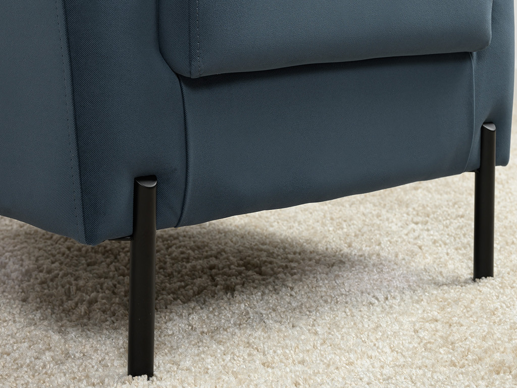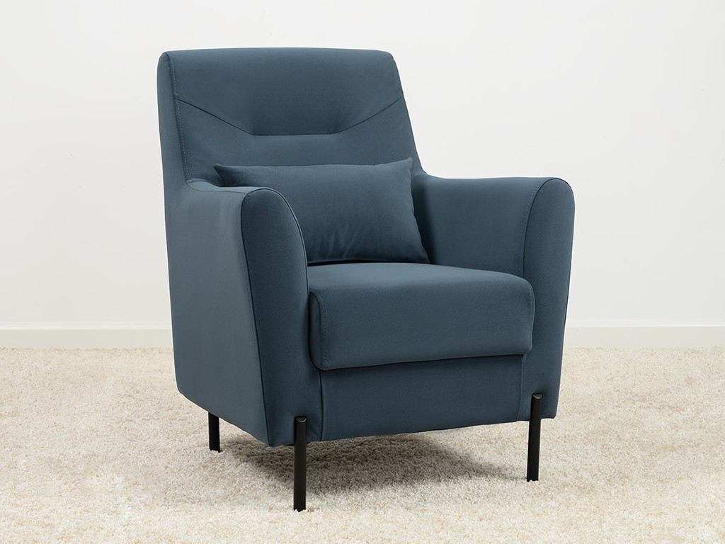 Декоративная утяжка на спинке кресла, декоративная подушка в цвете кресла, металлические опоры переходят в декоративный элемент подлокотника