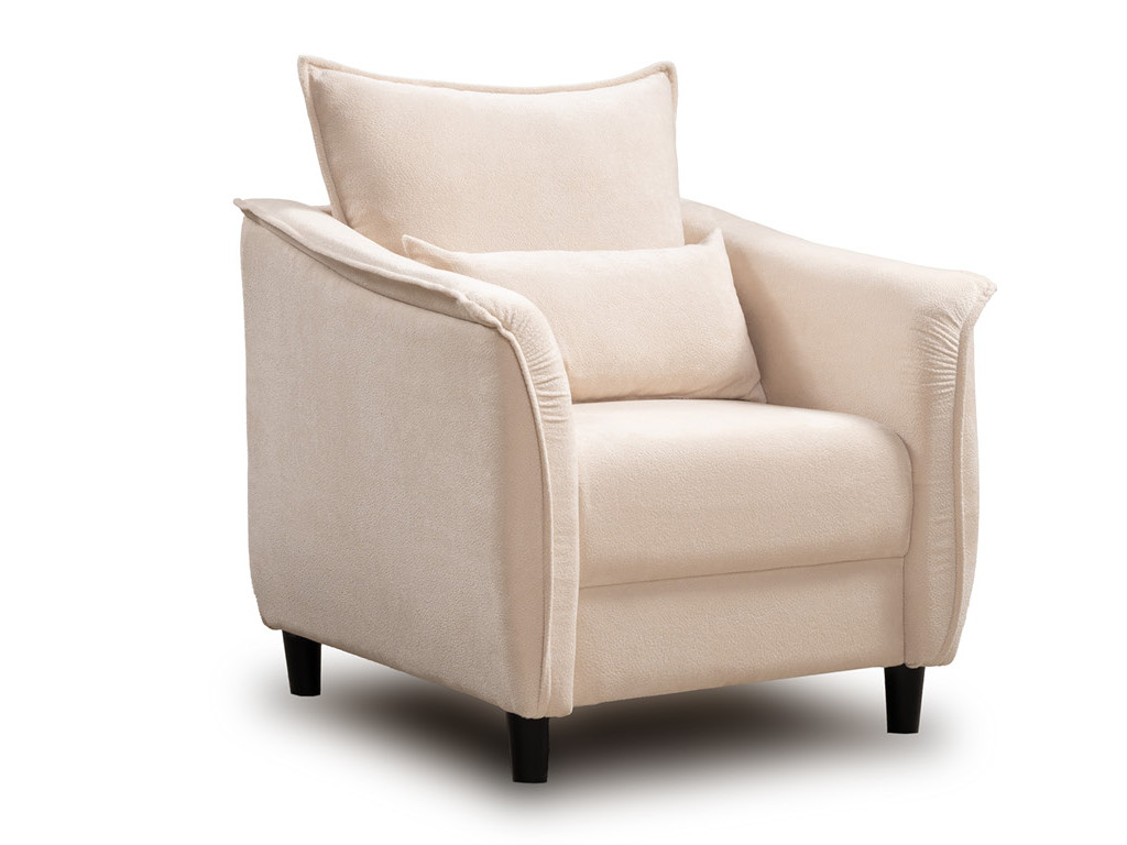 Кресло с приспинной подушкой трапецивидной формы на молнии, по трем сторонам которой проложена отделочная строчка на 1,2 см. По контуру боковин проложен декоративный кант на 1,2 см основной ткани. Кант проходит по центру передней части боковины, а по внутренней верхней части сборка.