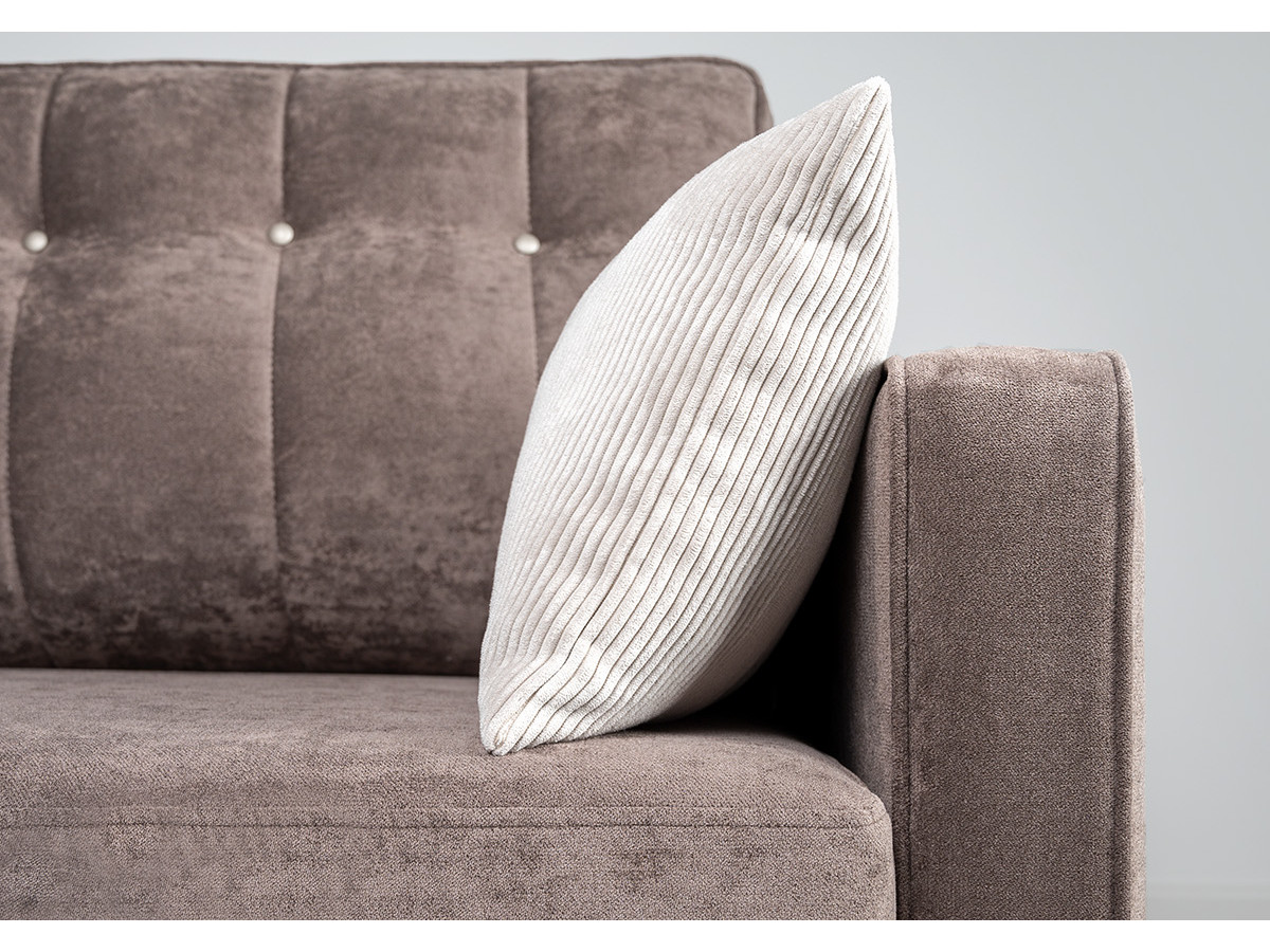 Подушки имеют трапециевидную форму, с утолщением к низу для комфорта посадки. Кант по всему периметру подушек, декоративные утяжки металлическими пуговицами, вертикальная стежка.