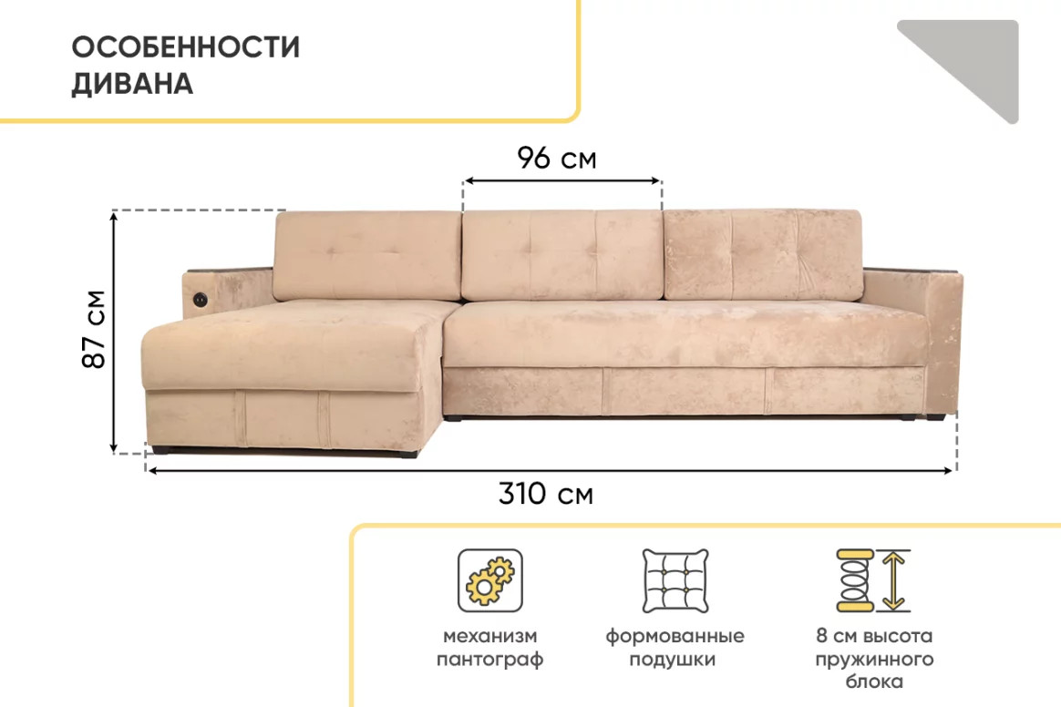 - Диван угловой Тургояк c USB розеткой Бежевый Ocean 130