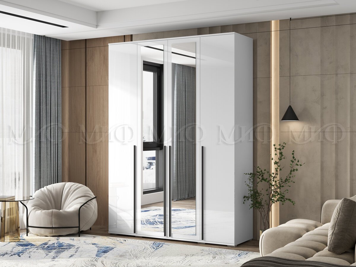 - Шкаф 4-х створчатый Норд 1600 с зеркалами белый глянец