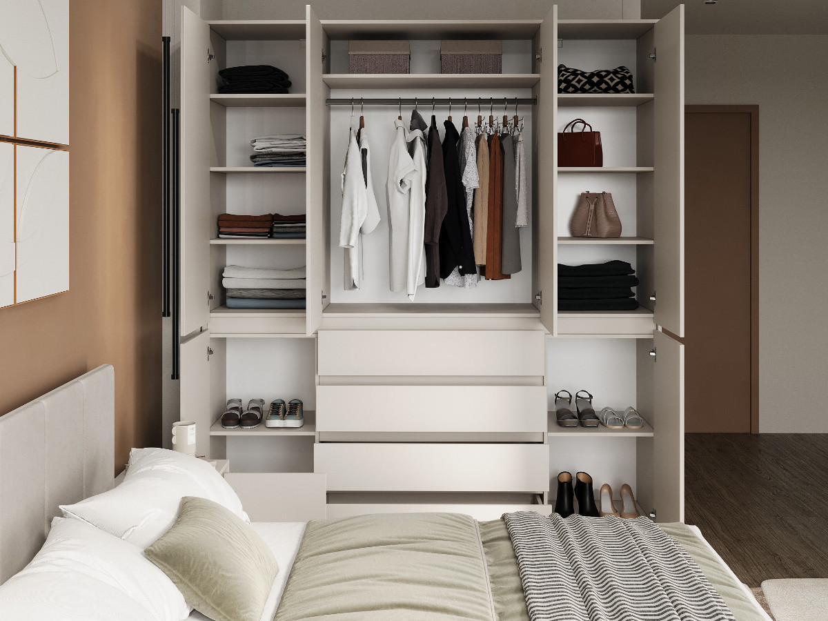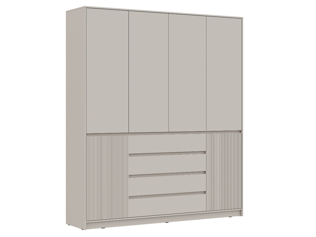 - Верхняя часть шкафа закрывается створками ЛДСП в цвет корпуса, нижняя фасадами МДФ с фрезеровкой. Створки, которые устанавливаются на перегородки, комплектуются полунакладными петлями. На боковины створки крепятся внутренними петлями.