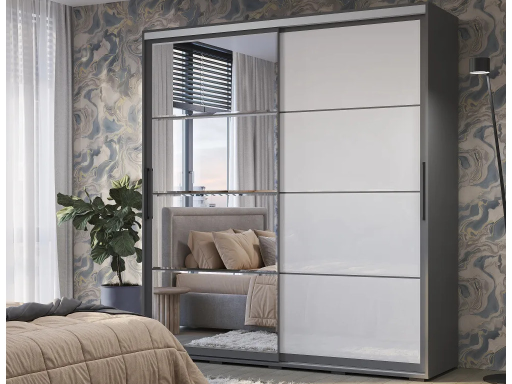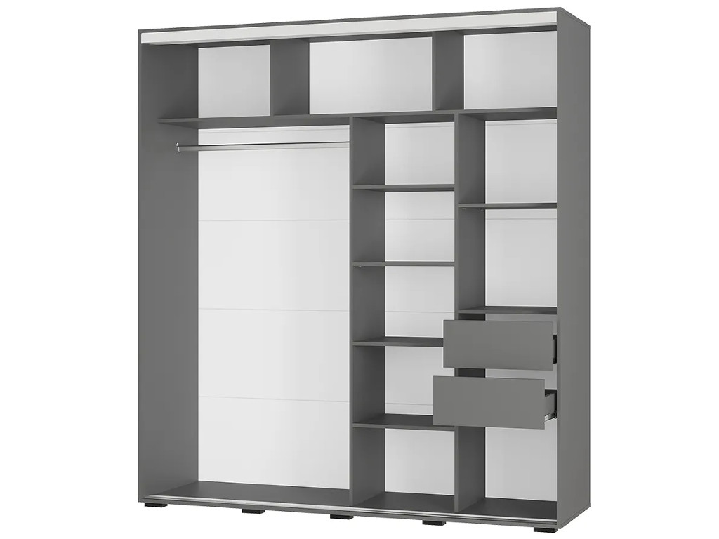 Модель изготовлена из ЛДСП; одна раздвижная створка выполнена из стекла с лакобелью, а вторая – зеркальная, такой прием облегчает конструкцию и позволяет расширить пространство. Внутри шкаф состоит из многочисленных полок и ящиков для белья и одежды, а также отделения со штангой для плечиков.