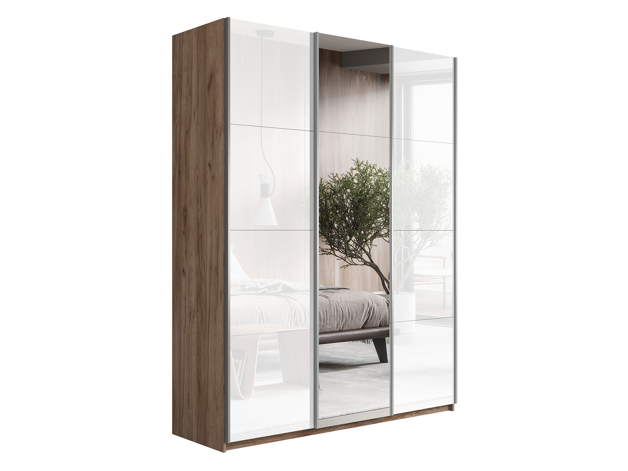 - Шкаф-купе Прайм 3-х дверный 1800 два Стекла Белые/Зеркало Крафт табачный